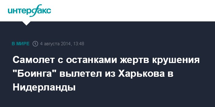 Москва. 4 августа. INTERFAX.RU - Самолет с останками жертв катастрофы малайзийского лайнера "Боинг 777", в понедельник вылетел в нидерландский Эйндховен. Грузовой борт вылетел из международного аэропорта "Харьков" в 12:25 по местному времени (13:25 по Москве).