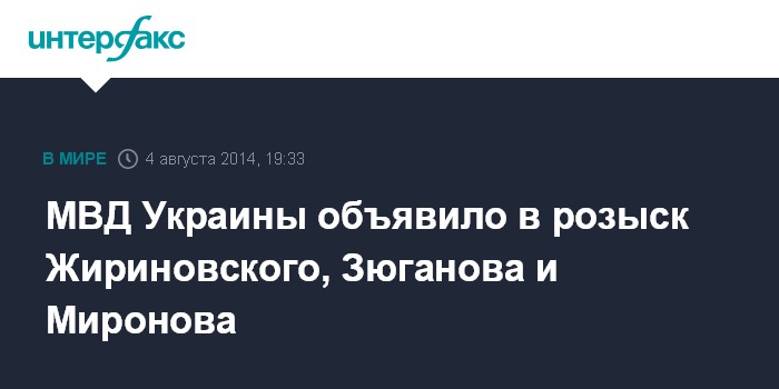Москва. 4 августа. INTERFAX.RU - Министерство внутренних дел Украины объявило в розыск граждан Сергея Миронова, Владимира Жириновского и Геннадия Зюганова. Соответствующая информация размещена на сайте МВД в понедельник в разделе "Лица, скрывающиеся от органов власти".