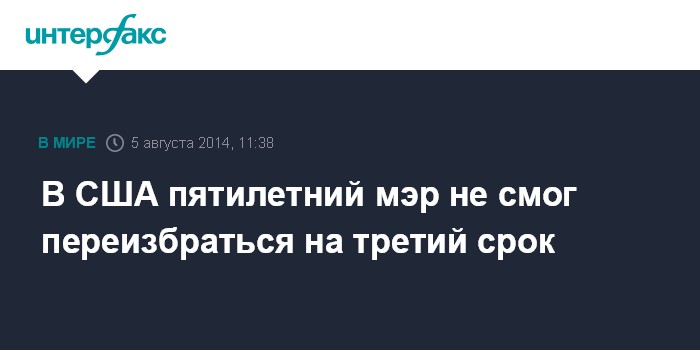 Москва. 5 августа. INTERFAX.RU - В городке Дорсет на севере Миннесоты 5-летний Роберт "Бобби" Тафтс проиграл выборы мэра 16-летнему Эрику Мюллеру, сообщает Fox News.