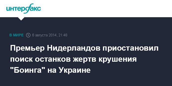 Москва. 6 августа. INTERFAX.RU - Премьер-министр Нидерландов Марк Рютте заявил в среду, что решил приостановить операцию по поиску останков людей, погибших при крушении самолета Malaysia Airlines на востоке Украины, сообщает агентство Associated Press.
