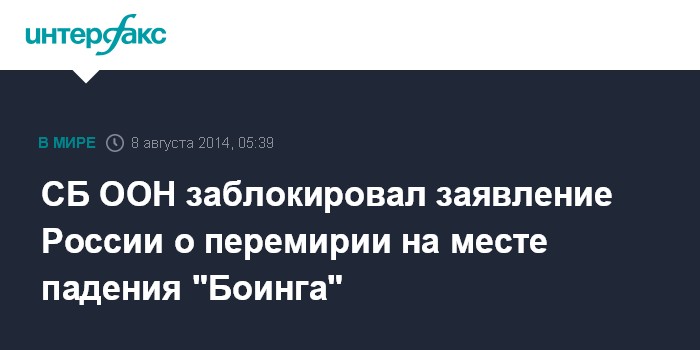 Москва. 8 августа. INTERFAX.RU - Совбез ООН заблокировал заявление России о перемирии на месте падения малайзийского Boeing, заявил журналистам постоянный представитель РФ при ООН Виталий Чуркин.