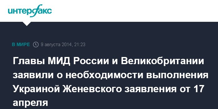 Главы МИД России и Великобритании заявили о необходимости выполнения Украиной Женевского заявления от 17 апреля