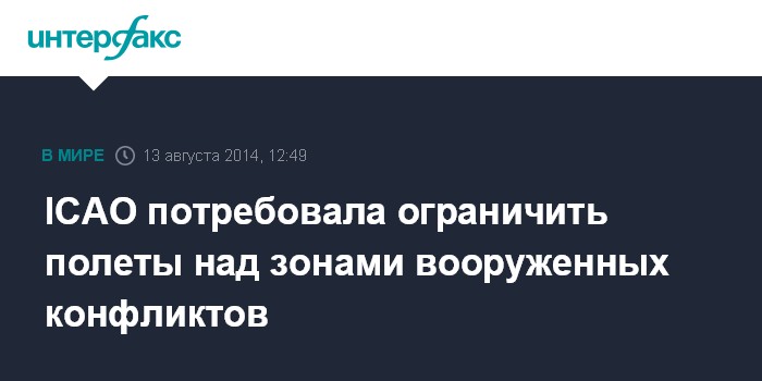 Москва. 13 августа. INTERFAX.RU - Международная организация гражданской авиации (ICAO) требует запрещать или ограничивать полеты в воздушном пространстве, затронутом вооруженным конфликтом, говорится в письме генерального секретаря ICAO Раймона Бенжамена, опубликованном на сайте Росавиации.