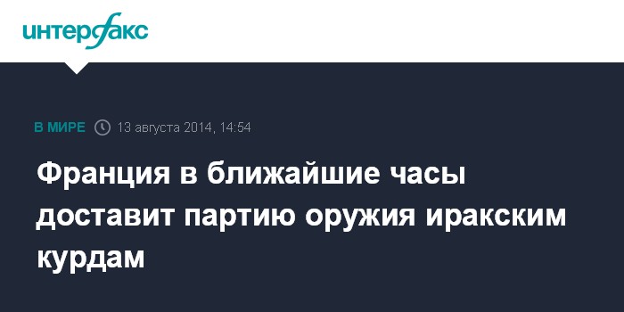 Москва. 13 августа. INTERFAX.RU - Власти Франции решили в течение среды осуществить первую поставку оружия военизированным формированиям, борющимся против экстремистов в Иракском Курдистане, сообщают парижские СМИ.