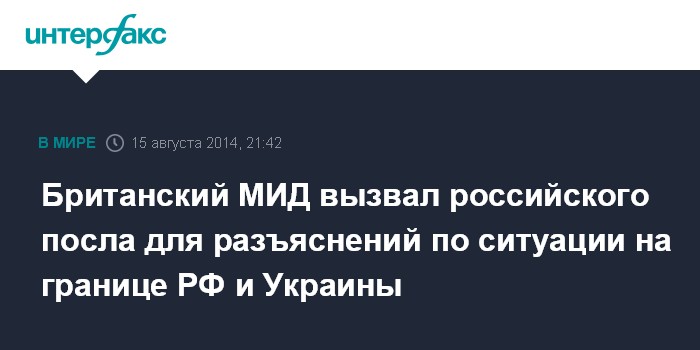 Москва. 15 августа. INTERFAX.RU - Посол России в Лондоне Александр Яковенко вызван в МИД Великобритании для разъяснений относительно появившихся в ряде западных СМИ данных о том, что российская военная техника якобы пересекла границу с Украиной, сообщили в пятницу в британском внешнеполитическом ведомстве.