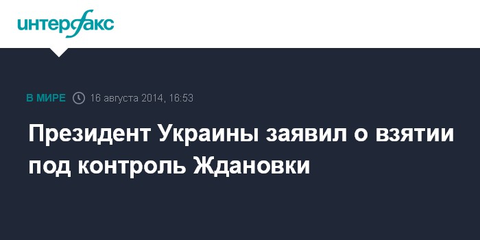 Москва. 16 августа. INTERFAX.RU - Президент Украины Петр Порошенко заявляет, что Вооруженные силы Украины заняли город Ждановка в Донецкой области. Об этом он написал в своем микроблоге в твиттере в субботу.