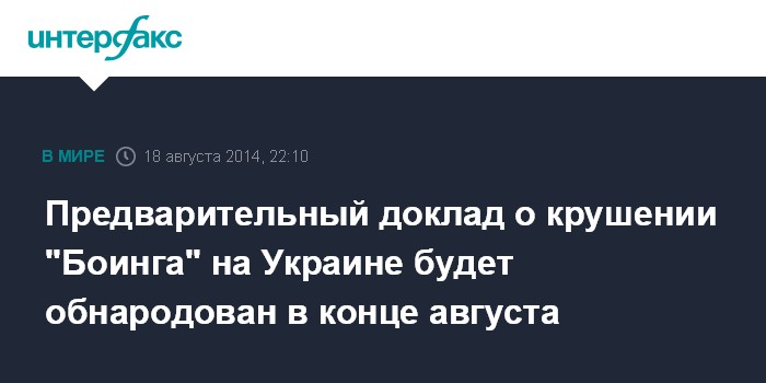 Москва. 18 августа. INTERFAX.RU - Предварительный доклад о расследовании крушения "Боинга" авиакомпании Malaysia Airlines на востоке Украины, как ожидается, будет опубликован в конце августа, заявил в понедельник постпред Великобритании при ООН Марк Лайалл Грант.