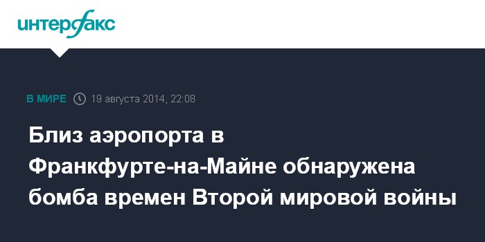Москва. 19 августа. INTERFAX.RU - Рабочие обнаружили бомбу 40-х годов прошлого века недалеко от аэропорта Франкфурта-на-Майне, работа которого частично приостановлена, пишет во вторник сайт немецкого журнала Der Spiegel.
