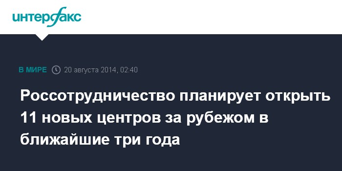 Москва. 20 августа. INTERFAX.RU - Россотрудничество планирует открыть 11 новых представительств за границей в течение трех лет, сообщил руководитель Федерального агентства по делам СНГ, соотечественников, проживающих за рубежом, и по международному гуманитарному сотрудничеству (Россотрудничество) Константин Косачев.