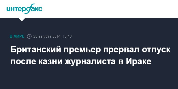 Москва. 20 августа. INTERFAX.RU - Премьер-министр Великобритании Дэвид Кэмерон срочно возвращается из отпуска для обсуждения с членами правительства ситуации в Ираке после расправы над американским журналистом, сообщил представитель Даунинг-стрит.