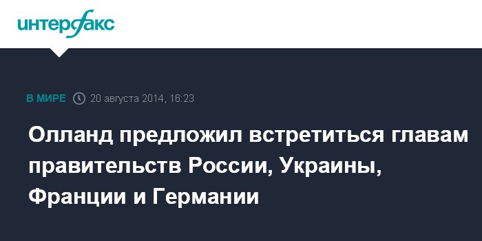 Москва. 20 августа. INTERFAX.RU - Президент Франции Франсуа Олланд предложил подумать над идеей созыва четырехсторонней встречи глав правительств Франции, Германии, России и Украины для обсуждения путей выхода из кризиса на Украине.