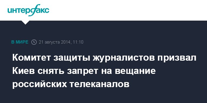 Москва. 21 августа. INTERFAX.RU - Базирующийся в США Комитет защиты журналистов выразил обеспокоенность запретом Киева на вещание российских телеканалов на территории Украины. В своем заявлении организация призвала снять ограничения немедленно.