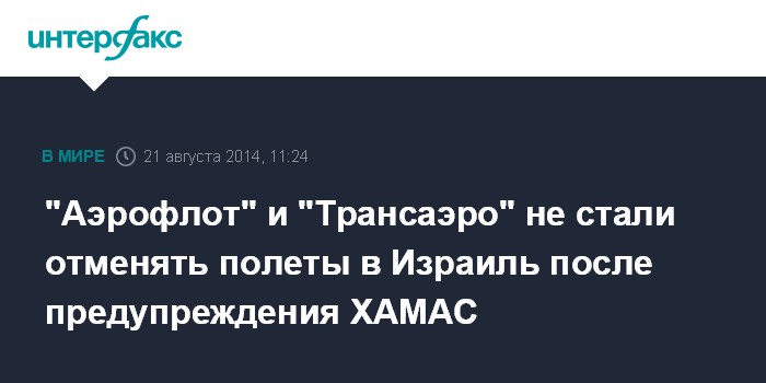 Москва. 21 августа. INTERFAX.RU - "Аэрофлот" и "Трансаэро" пока не отменили рейсы в аэропорт Бен-Гурион (Тель-Авив), несмотря на призыв палестинского движения ХАМАС избегать полетов.