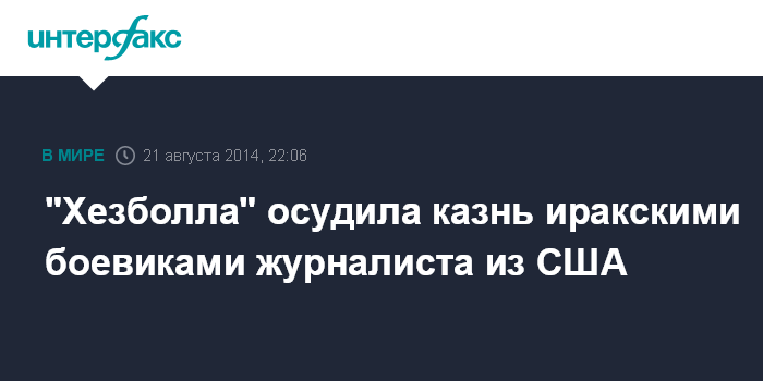Москва. 21 августа. INTERFAX.RU - Ливанское шиитское движение "Хезболла" в четверг выступило с осуждением убийства боевиками радикальной группировки "Исламское государство" (ИГ) американского журналиста Джеймса Фоули.