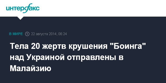 Москва. 22 августа. INTERFAX.RU - Тела 20 погибших в результате катастрофы "Боинга" на востоке Украины малайзийцев будут доставлены в пятницу в Куала-Лумпур, сообщает BBC.