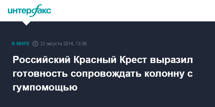 Москва. 22 августа. INTERFAX.RU - Российский Красный Крест (РКК) поддерживает начало движения гуманитарного конвоя к Луганску и готов его сопровождать, сообщила "Интерфаксу" в пятницу глава РКК Раиса Лукутцова.