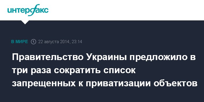Москва. 22 августа. INTERFAX.RU - Правительство Украины предложило уменьшить количество не подлежащих приватизации объектов почти на две трети - с 1478 до 543, сообщает пресс-служба Кабинета министров Украины.