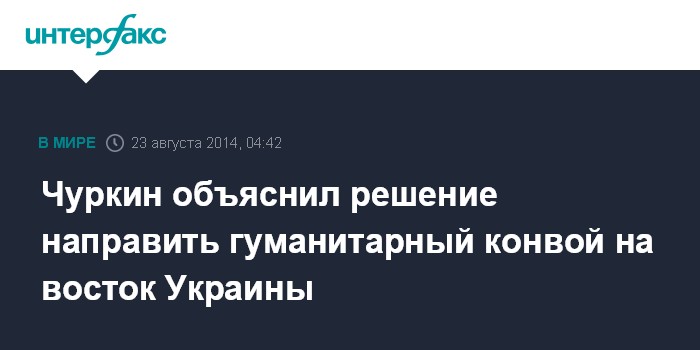 Москва. 23 августа. INTERFAX.RU - Постоянный представитель России при ООН Виталий Чуркин заявил, что Россия приняла решение направить на восток Украины гуманитарный груза в связи с необходимостью в гуманитарной помощи, передает в субботу телеканал "Россия 24".