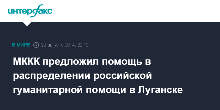 Москва. 23 августа. INTERFAX.RU - Международный комитет Красного Креста (МККК) выразил готовность оказать экспертное содействие властям самопровозглашенной Луганской народной республики (ЛНР) в распределении гуманитарной помощи, прибывшей из России, сообщает организация.