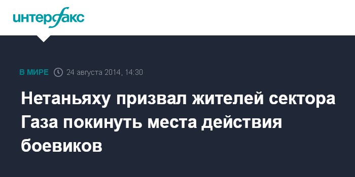 Москва. 24 августа. INTERFAX.RU - Премьер-министр Израиля Биньямин Нетаньяху в воскресенье призвал мирных жителей сектора Газа покинуть районы, где действуют боевики ХАМАС, сообщает в воскресенье израильская газета "Гаарец". "Я призываю жителей Газы немедленно покинуть те места, из которых ХАМАС осуществлять свою деятельность. Каждый, кто там находится, является нашей целью", - заявил он в Тель-Авиве.