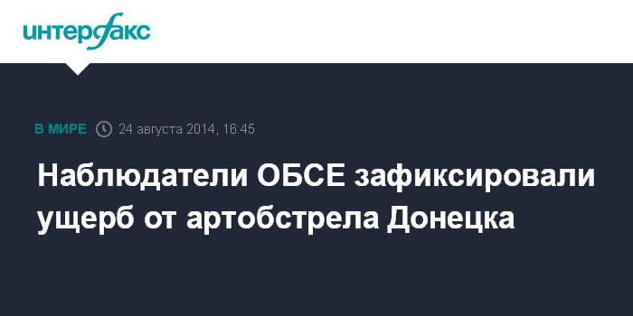 Москва. 24 августа. INTERFAX.RU - Наблюдатели ОБСЕ в воскресенье опубликовали доклад, в котором зафиксировали ущерб от обстрела Калининского района Донецка и гибель мирных жителей.