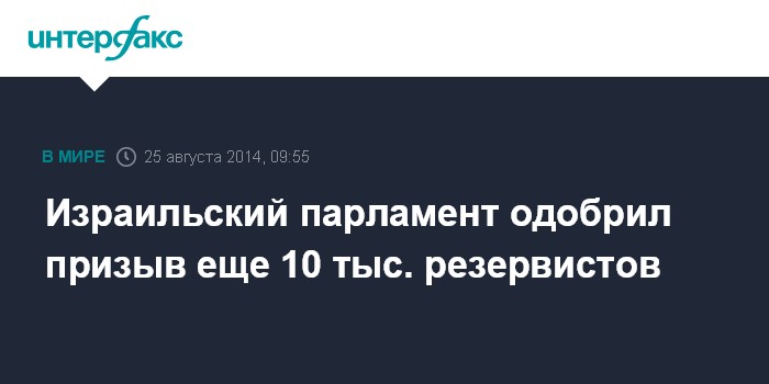 Москва. 25 августа. INTERFAX.RU - Комитет по иностранным делам и обороне в Кнессете разрешил правительству призвать дополнительно 10 тыс. резервистов, сообщает израильская газета The Jerusalem Post.