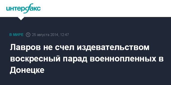 Москва. 25 августа. INTERFAX.RU - Министр иностранных дел Сергей Лавров не усмотрел издевательств над военнопленными на так называемом "параде", который в пику военному параду в День независимости Украины в Киеве провели в Донецке вооруженные формирования "Донецкой народной республики" в минувшее воскресенье.