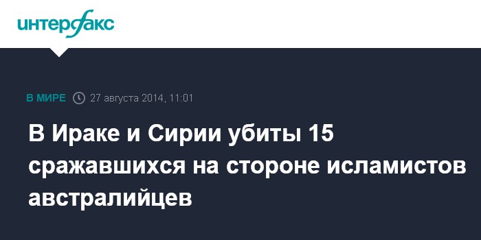 Москва. 27 августа. INTERFAX.RU - Не менее 15 граждан Австралии погибли в Ираке и Сирии, воюя на стороне исламских радикалов, сообщил в среду глава Австралийской службы безопасности и разведки (АСБР) Дэвид Ирвин.
