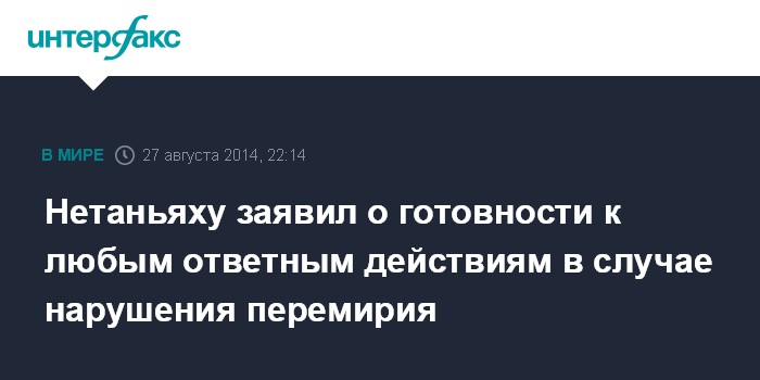 Москва. 27 августа. INTERFAX.RU - Израиль предпримет ответные действия, если палестинское движение ХАМАС нарушит условия режима прекращения огня, заявил в среду премьер-министр Израиля Биньямин Нетаньяху.