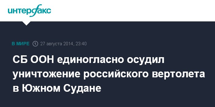 Москва. 27 августа. INTERFAX.RU - Совет Безопасности ООН выступил с осуждением атаки на российский вертолет в Южном Судане, приведшей к гибели трех членов экипажа.
