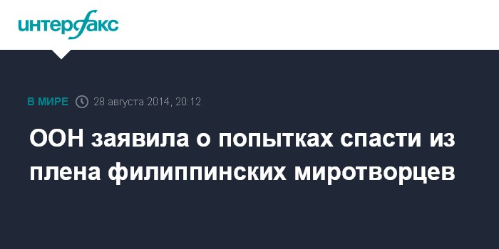 Москва. 28 августа. INTERFAX.RU - ООН принимает меры для освобождения 43 миротворцев из Филиппин, которые были взяты в плен на территории Голанских высот боевиками, пришедшими с территории Сирии, говорится в четверг в заявлении организации.