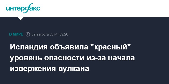 Москва. 29 августа. INTERFAX.RU - Власти Исландии объявили наивысший, "красный", уровень опасности для воздушных судов из-за начала извержения вулкана Бардарбунга, сообщает в пятницу исландская телерадиокомпания РУВ.