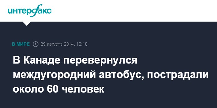 Москва. 29 августа. INTERFAX.RU - Не менее 56 пассажиров междугороднего автобуса получили травмы после того, как он перевернулся неподалеку от города Мерритт на западе Канады, сообщает в пятницу канадский телеканал CBC.