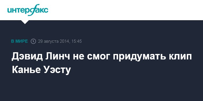 Москва. 29 августа. INTERFAX.RU - Известный американский режиссер Дэвид Линч признался, что отказался от съемок клипа на песню рэпера Канье Уэста, так как не смог придумать интересную идею для видео. Об этом он сообщил в интервью The Daily Beast.