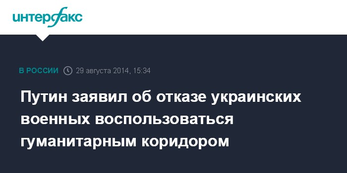 Москва. 29 августа. INTERFAX.RU - Президент РФ Владимир Путин заявил, что украинское командование не намерено пользоваться гуманитарным коридором, чтобы вывести свои войска из окружения.