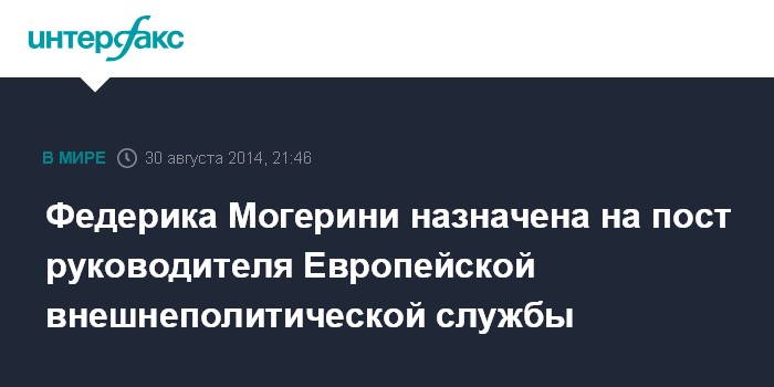 Москва. 30 августа. INTERFAX.RU - Глава МИД Италии Федерика Могерини назначена на пост верховного представителя ЕС по иностранным делам и политике безопасности, сообщил в твиттере в субботу глава Европейского совета Херман Ван Ромпей.