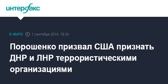 Порошенко также заявил о намерении во время визита в США во второй половине сентября поднять вопрос о признании ДНР и ЛНР террористическими организациями, отмечает пресс-служба.