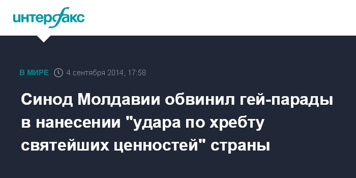Москва. 4 сентября. INTERFAX.RU - Синод Православной церкви Молдавии осудил проведение гей-парадов и другие последствия закона "Об обеспечении равенства", принятого парламентом республики в мае 2012 года.