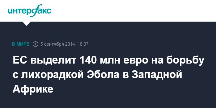 Москва. 5 сентября. INTERFAX.RU - Европейская комиссия приняла решение выделить 140 млн евро странам, в которых вспыхнула эпидемия лихорадки Эбола, сообщил на брифинге в Брюсселе официальный представитель ЕК. Помощь будет выделена странам Западной Африки: Гвинее, Сьерра-Леоне, Либерии и Нигерии.