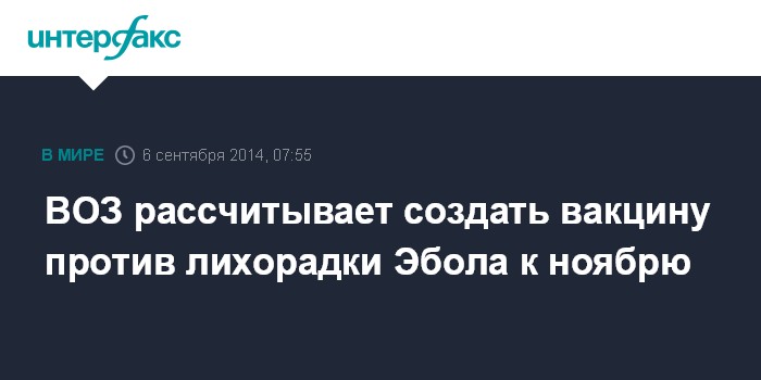 Москва. 6 сентября. INTERFAX.RU - Вакцина против геммарогической лихорадки Эбола может быть получена уже к ноябрб этого года, заявили врачи из Всемирной организации здравоохранения в Женеве. Об этом сообщает BBC.