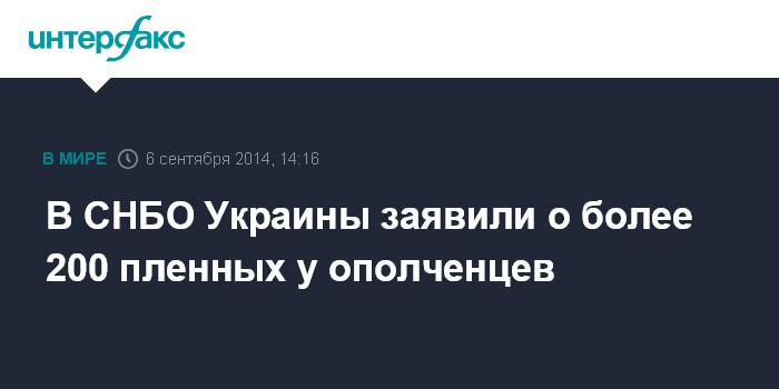 Москва. 6 сентября. INTERFAX.RU - Количество пленных, которые находятся у ополченцев, точно неизвестно, сообщил представитель информационно-аналитического центра СНБО Украины Андрей Лысенко. "Пока что мы не можем сказать точных сведений о тех, кто находится в заложниках. Мы можем единственное сказать, что это более 200. Это точно", - сказал он на брифинге в субботу.