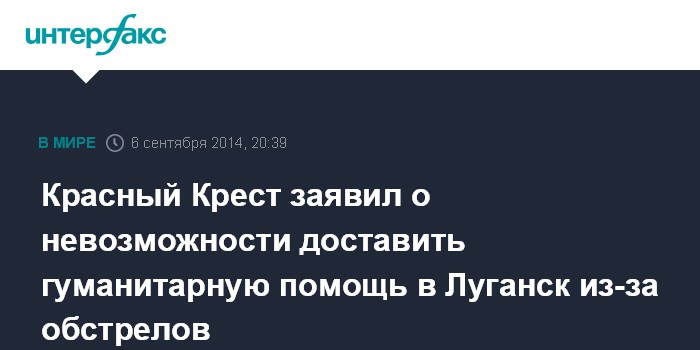 Москва. 6 сентября. INTERFAX.RU - Международному комитету Красного Креста (МККК) не удалось доставить в субботу гуманитарный груз в Луганск из-за артиллерийского обстрела, сообщил твиттер МККК.