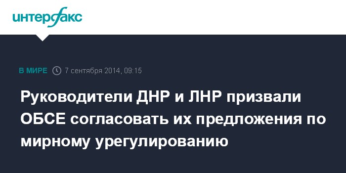 Москва. 7 сентября. INTERFAX.RU - Руководители самопровозглашенных Донецкой и Луганской народных республик призвали ОБСЕ скорее согласовать их предложения по реализации минских договоренностей и обеспечить беспристрастный международный контроль за режимом прекращения огня.