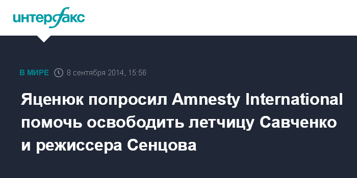 Москва. 8 сентября. INTERFAX.RU - Премьер-министр Украины Арсений Яценюк попросил генерального секретаря международной правозащитной организации Amnesty International Салила Шетти о содействии в освобождении режиссера Олега Сенцова и летчицы Надежды Савченко, находящихся в РФ под арестом.