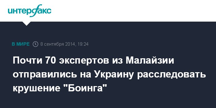 Москва. 8 сентября. INTERFAX.RU - В воскресенье вечером из Малайзии на Украину отправилась специальная команда экспертов, которые намерены обследовать место крушения "Боинга-777" в Донецкой области, сообщают малайзийские интернет-издания в понедельник.