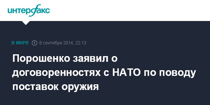 Москва. 8 сентября. INTERFAX.RU - Киев договорился с нескольким странами Североатлантического альянса о прямых поставках вооружения. Об этом в понедельник заявил президент Украины Петр Порошенко.