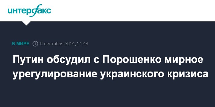 Москва. 9 сентября. INTERFAX.RU - Состоялся телефонный разговор президентов России и Украины Владимира Путина и Петра Порошенко, в ходе которого "была акцентирована важность обеспечения сторонами внутриукраинского конфликта устойчивого режима прекращения огня на Юго-Востоке страны", сообщает пресс-служба Кремля.