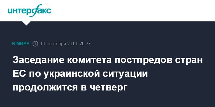 Москва. 10 сентября. INTERFAX.RU - Постоянные представители стран ЕС обсуждали в среду ситуацию на Украине и вопрос об имплементации ограничительных мер в отношении России, сообщил "Интерфаксу" вечером 10 сентября дипломат из учреждений Евросоюза.