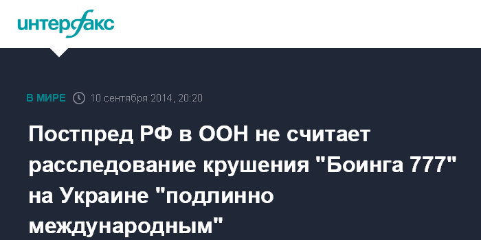 Москва. 10 сентября. INTERFAX.RU - Проведенное расследование о причинах крушения малазийского "Боинга 777" над Украиной сложно назвать по-настоящему международным, считает постпред РФ при ООН Виталий Чуркин.