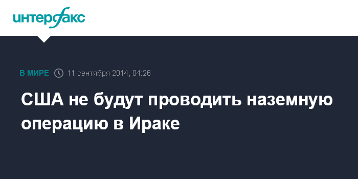 Москва. 11 сентября. INTERFAX.RU - Президент США Барак Обама заявил, что наземной операции в Ираке не будет, Вашингтон будет бороться с боевиками "Исламского государства" с помощью авиации, сообщила в четверг BBC News.